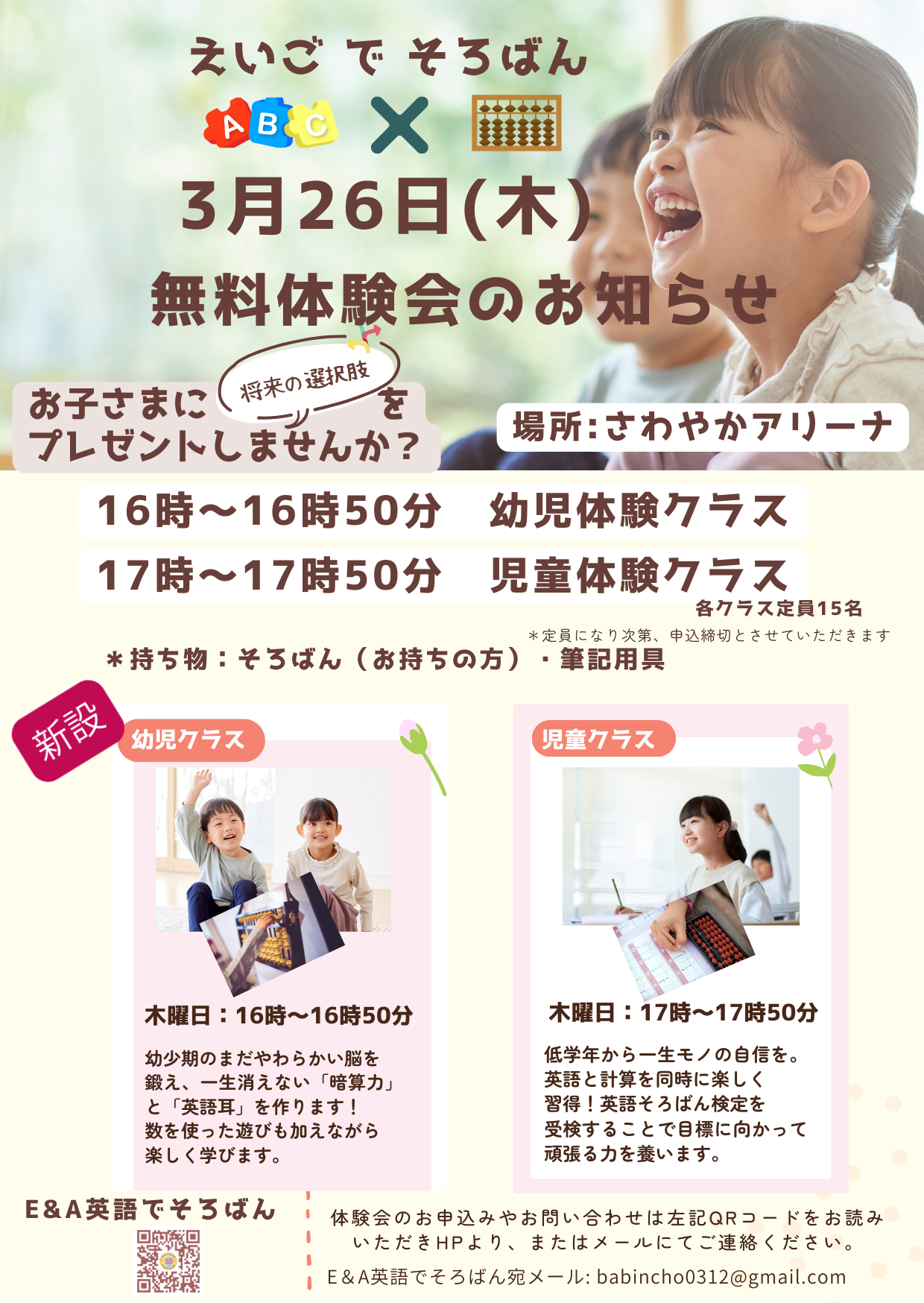 2026年3月26日(木)袋井市さわやかアリーナにて英語そろばん体験会を行います。16時~幼児クラス、17時~小学生クラスとなる予定です。詳しくは下記をご覧ください。 |